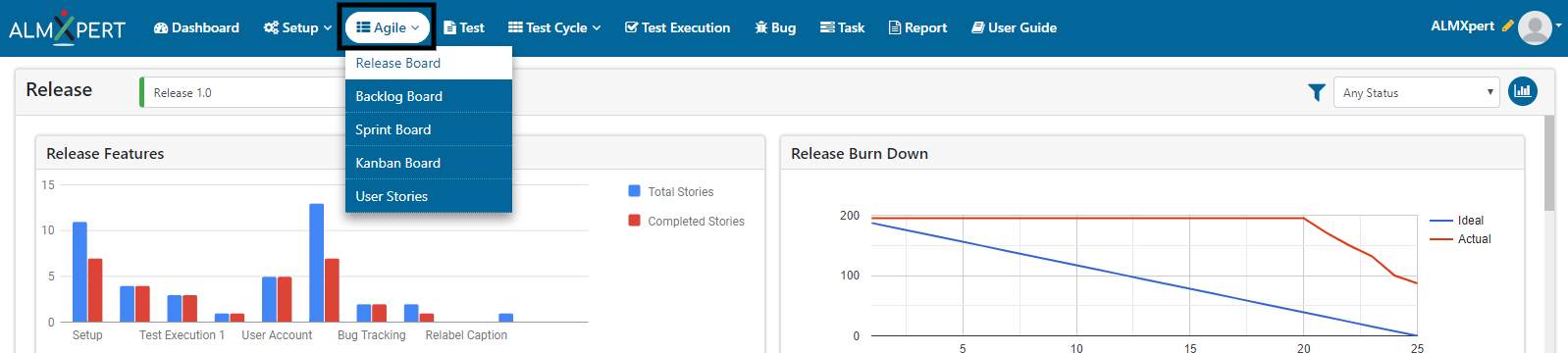 Agile menu bar option gives users to manage projects in an agile way, users should hovar mouse on ‘Agile’ option from menu bar. Users can create Releases, Features, User Stories, User Story tasks and Sprints from this option. ALMXpert gives liberty to use Scrum, Scrumban or Kanban methodology to manage projects. Projects/products can be managed with the help of inbuilt Scrum and Kanban boards.
