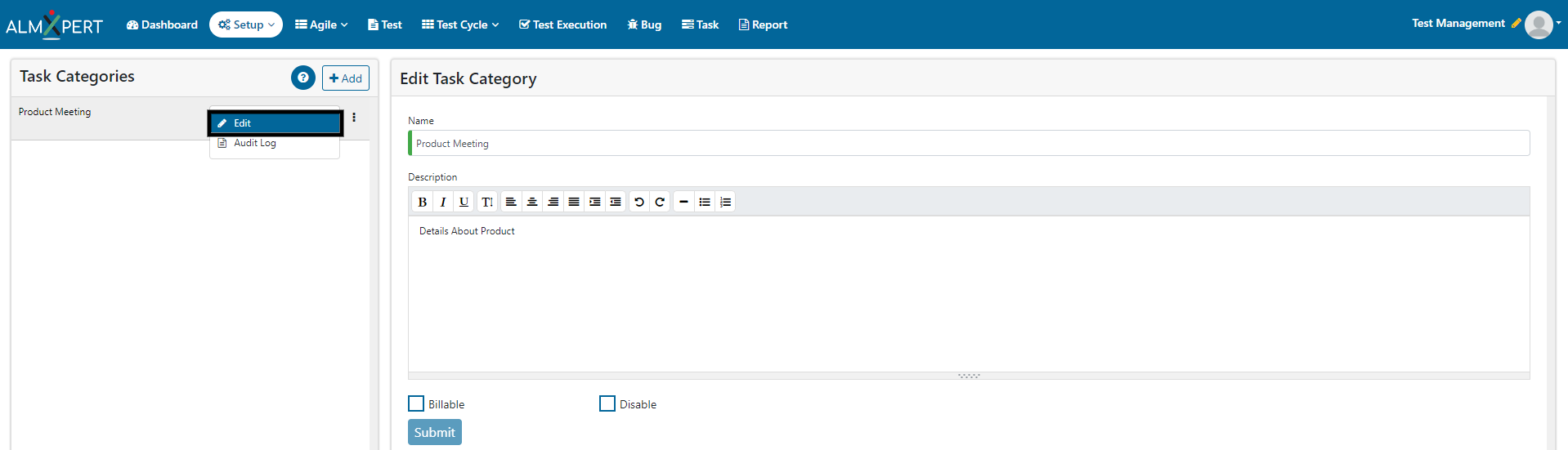 This option allows to add task categories to record tasks those are not recorded under any predefined category like user story task, Kanban task. Here user can record time for categories like internal meeting, client meeting, time off taken, holiday as this will be added to their time to report accurate data while generating resource time related reports. Users can add new category of task, edit existing category of task and view audit log details of existing categories in this section.